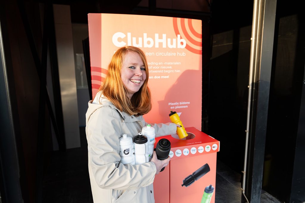 Biobased, volledig recyclebare bidons, ingezameld via ClubHub en gebruikt voor nieuwe sportartikelen.